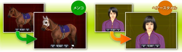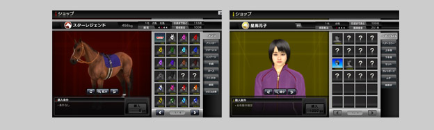 競走馬や騎手のアイテム装備例 (愛馬や騎手を自分好みにチェンジ!)