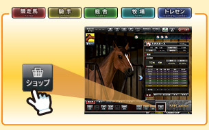 競走馬や騎手の装備品、種牡馬株券や繁殖牝馬株券、廐舎建替など、様々なアイテムを購入できます。 「競走馬」「騎手」「廐舎」「牧場」「トレセン」の5種類、それぞれで内容が違います。