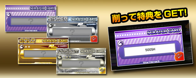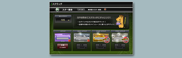 SP(スクラッチポイント)を貯めることで、ウイニングラリー勝利マーク・アイテム・SHなどの豪華特典が当たる「スクラッチカード」を入手できます。