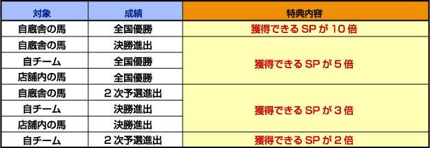 ※ あなた自身の所有馬か、パートナー廐舎の所有馬が勝利した場合、2倍のSPがもらえます!