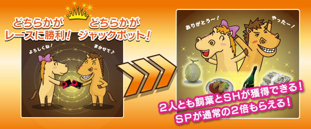 どちらかがレースに勝利したり、ジャックポット獲得したりすると、2人とも、飼葉とSHが獲得できたり、SPが通常の2倍もらえたりするよ!