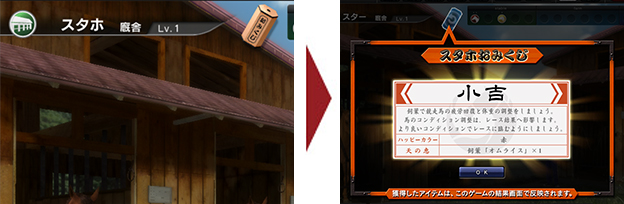 引いた時点での廐舎レベルに応じて、おみくじに書かれている内容が変化します。