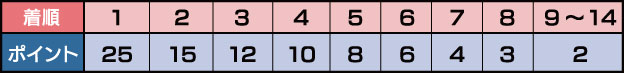 決勝の総合ポイントにより、最終順位が決定します。 (同点の場合は、第5レースの着順により順位を決定します。) ■着順ポイントテーブル 着順による獲得ポイントは以下のようになっています。