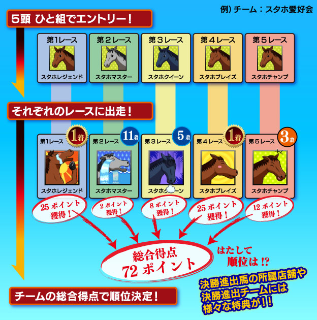プレミアカップは5頭ひと組でエントリーします。5頭の馬がそれぞれのレースに出走し、着順に応じたポイントを獲得します。チームの合計ポイントによって順位を競います。