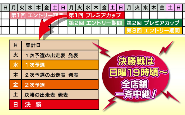 プレミアカップのスケジュールは以下のようになっています。最初の1週間(エントリー期間中)に出走登録を行ってください。次の1週間で予選と決勝が行われます。